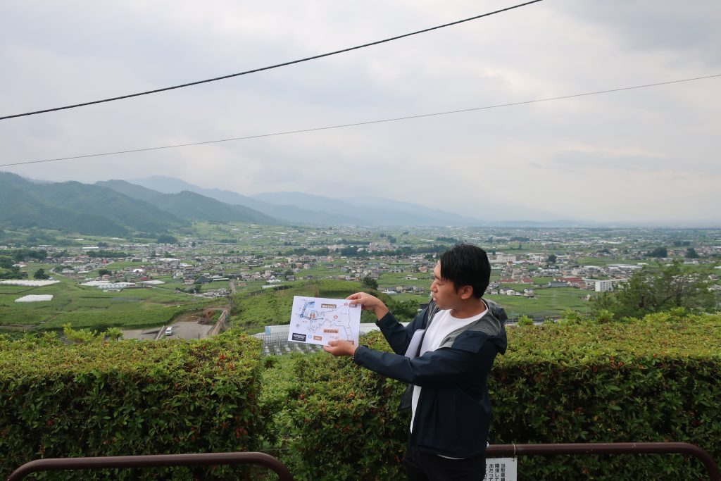 次に、菱山地区から勝沼鳥居平へ山の麓に沿いながら歩いて、畑を見学しました。このあたりになると、「笹子下ろし」と呼ばれる柏尾山とその隣の中央道寄りにある山との間にある谷底のような経路に沿った、富士山からの冷涼な風が感じられます。スタッフのみんなも、「これが笹子下ろしか~」や、「涼しい~」などと実際に風を肌で感じていました。少々汗ばむ陽気だったこともあり、暑い夏に当たるクーラーのような心地よい笹子下ろしに「もっと吹いて~!」といった声もちらほら聞こえました(笑)