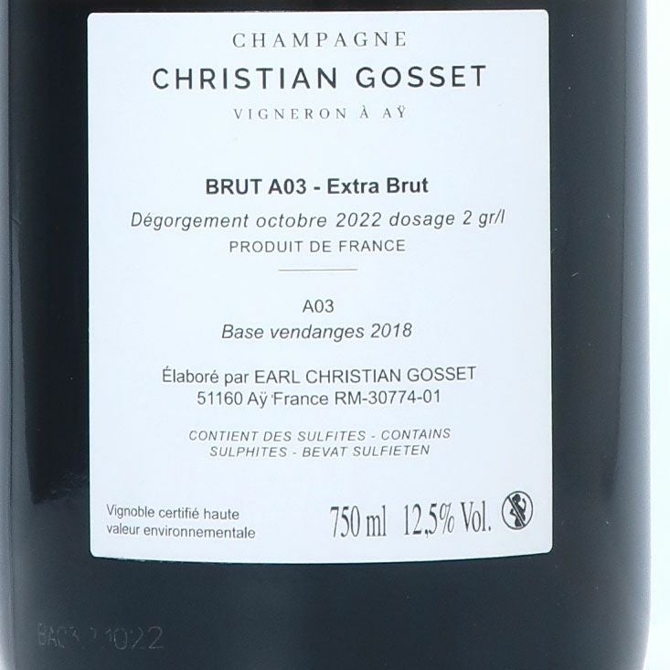 他の画像を見る クリスチャン・ゴセ A03 グラン・クリュ エクストラ・ブリュット NV<ベース2018> クール便でお届け可能 通常価格 ¥ 12,100 (税込) WG価格 ¥ 11,600 税込 (0) 緻密で躍動感のある名刺代わりのキュヴェ 2018年をベースに、ゴセ・ブラバンからのヴァン・ド・レゼルヴを40%使用。良い素材をもとに細部までこだわって丁寧に造られた事が窺い知れる、緻密で躍動感のある味わいです。 品種:ピノ・ノワール85%(アイ村)、シャルドネ15%(シュイィ村) 泡・辛口 カートに入れる お気に入りに登録する