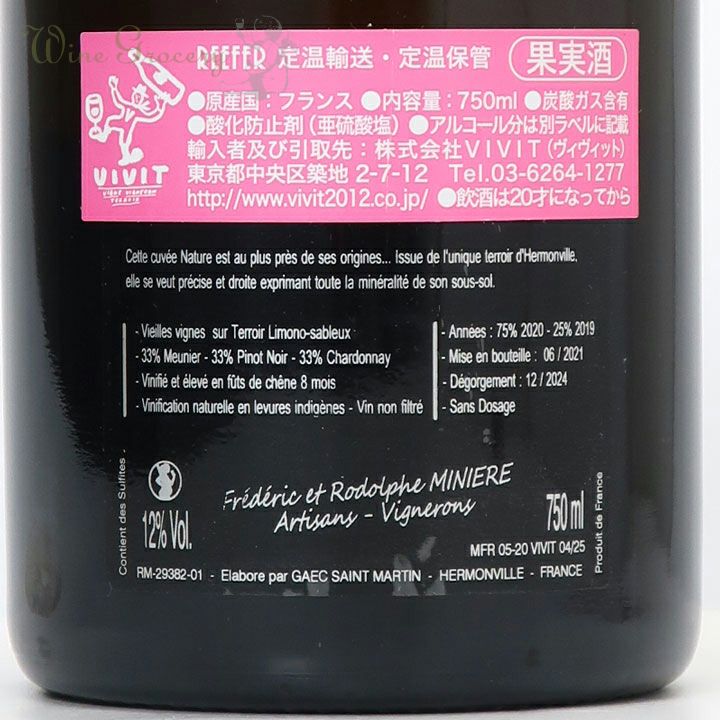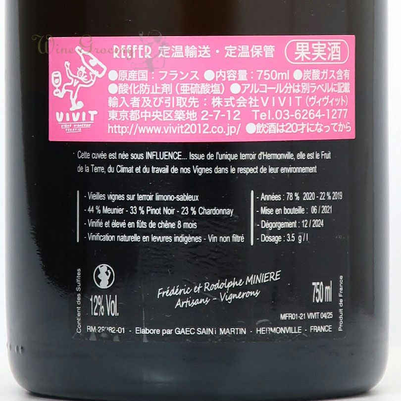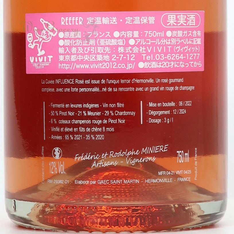 他の画像を見る ミニエール F&R アンフリュアンス ロゼ NV クール便でお届け可能 販売期間 2026/02/21 10:30 〜 WG価格 ¥ 14,300 税込 (0) ドメーヌ唯一のロゼ・シャンパーニュ! 赤い果実の香りは複雑かつエレガントで、上質な味わいの中にもフレッシュさが感じられます。酸とフェノリックスがきれいに調和し、焦点のあった集中力のある味わいが特徴的です。ミニエールらしいミネラルの張りが調和する、 エレガントで洗練されたロゼ・シャンパーニュです。 品種:ピノ・ノワール50%、シャルドネ29%、ムニエ21% ロゼ・泡・辛口 在庫切れ 詳細を見る お気に入りに登録する