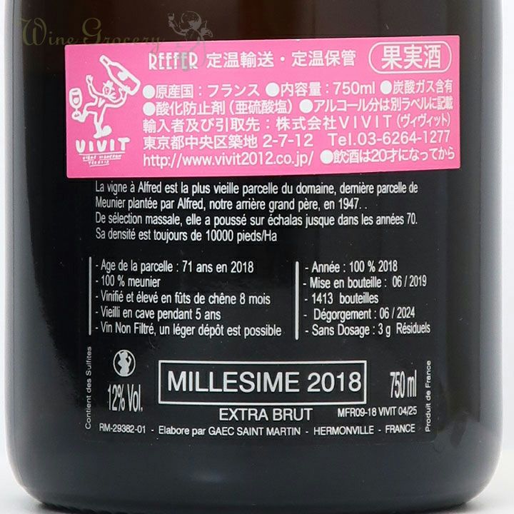 他の画像を見る ミニエール F&R ラ・ヴィーニュ・ア・アルフレッド 2018 クール便でお届け可能 販売期間 2026/02/21 10:30 〜 WG価格 ¥ 19,800 税込 (0) 古樹から造られる極めて希少な泡! こちらのキュヴェは、ドメーヌで最も古い歴史を持つ区画から収穫されたブドウを使用します。ブドウ樹は、現当主の曾祖父に当たるアルフレッド氏が1947年に植樹したもので、樹齢70年以上にも及びます。オーク樽にて8カ月間熟成させ、瓶詰後、地下セラーでさらに5年間熟成させます。無濾過で造っており、ドザージュ量は3g/lです。生産本数が1,413本と極めて少ないアイテムです。 品種:ムニエ100% 泡・辛口 在庫切れ 詳細を見る お気に入りに登録する