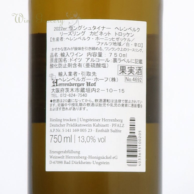 他の画像を見る ヘレンベルク・ホーニッヒゼッケル ウングシュタイナー ヘレンベルク リースリング カビネット トロッケン 2022(ドイツフェア2026) クール便でお届け可能 販売期間 2026/04/02 8:30 〜 2026/05/06 23:59 通常価格 ¥ 2,530 (税込) WG価格 ¥ 2,460 税込 (0) 厚みのある果実味と爽やかな酸が織りなす調和 ワイナリーの看板品種であり、ファルツの典型的なスタイルを目指して造られたリースリング。ステンレスタンクでの熟成。夏蜜柑のような少し熟した厚みのある果実味と、爽やかな酸が特徴的です。 品種:リースリング100% 白・辛口 カートに入れる お気に入りに登録する