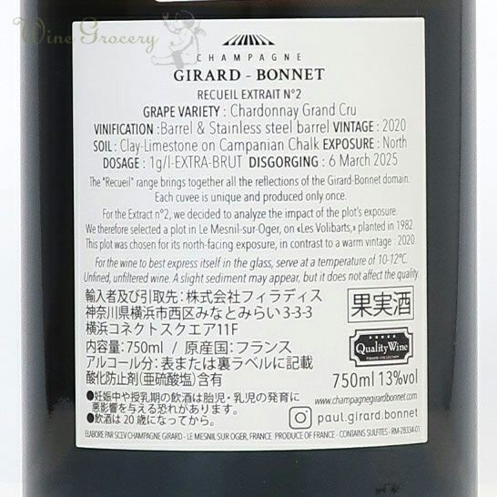 他の画像を見る ジラール・ボネ ルクイユ エクストレ ニュメロ・ドゥ 2020 クール便でお届け可能 通常価格 ¥ 17,050 (税込) WG価格 ¥ 16,600 税込 (0) 各ヴィンテージ一度しか造られない唯一無二の作品 ルクイユ・シリーズは毎年特定のアイディアに基づいて造られ、各ヴィンテージ一度しか造られない唯一無二の作品です。2020年ヴィンテージはメニルのリュー・ディ「レ・ヴォリバール」のシャルドネを使用したブラン・ド・ブラン。ステンレスタンクとオーク樽にて発酵。澱と共に10カ月の熟成後、42カ月間の瓶内熟成。ドサージュは1g/L 。 品種:シャルドネ100% 泡・辛口 在庫切れ 詳細を見る お気に入りに登録する